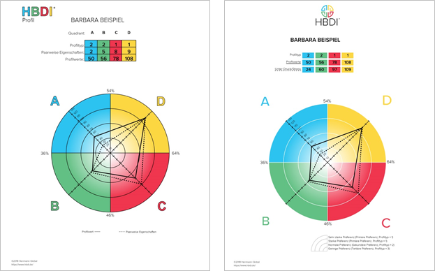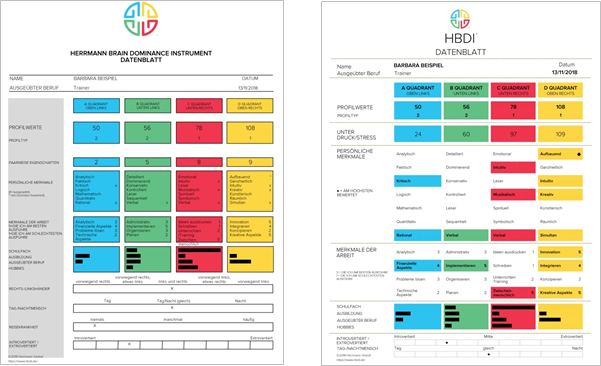Zu jedem HBDI® Profil gehören drei verschiedenen Darstellungsweisen: die Grafik, als Datenblatt und die Textseite, um den verschiedenen Präferenzen für das visuelle Erfassen, Analysieren und Lesen gerecht zu werden.