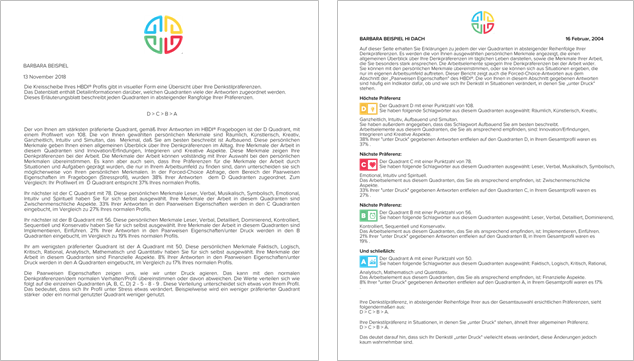 Die Profile im neuen Design sind vergleichbar mit der alten Version, es gibt jedoch deutliche Unterschiede. Diese sind leicht erkennbar, wenn man beide Versionen miteinander vergleicht. Nachfolgend finden Sie alle Seiten des "alten" und "neuen" HBDI® Einzelprofils. Wenn Sie darüberhinaus Fragen haben, wenden Sie sich bitte an Ihren Ansprechpartner von Herrmann International.